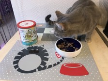 Meine kleine Maxi (liebt das Katzen Nassfutter, vor allem die Sorten mit Fisch) und die Kater Zois, Apollon und Roco beim Hirsch testen. Felina und Orpheus mögen das Nassfutter auch gerne. Nur unsere Seniorin von 15 Jahren wollte sich einfach nicht umgewöhnen lassen.